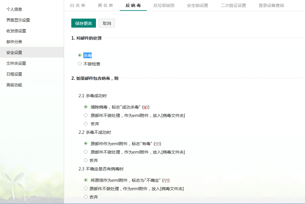- 如果您购买了并安装 Sophos 杀毒引擎,则系统不仅可以帮您扫描病毒邮件,还可从病毒邮件中清除病毒,对您的邮件不产生任何危害的过程。